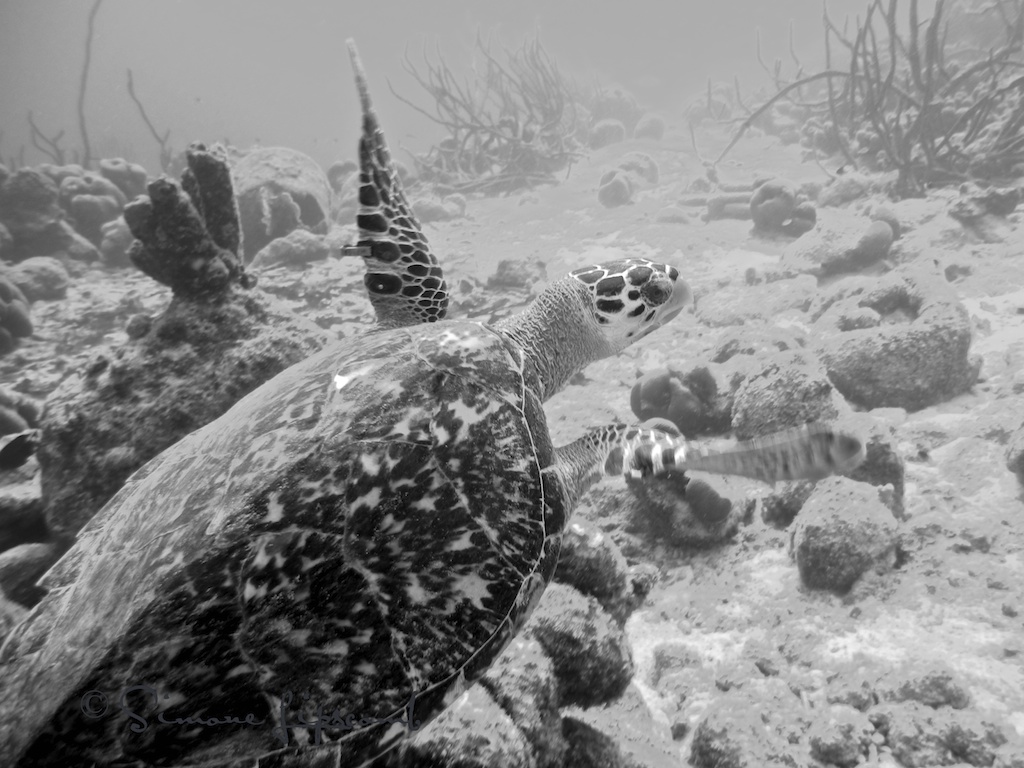After about 30 minutes my dive buddy turned back and I wanted to check on a coral farm further north so I kept going. Not long after we parted, a beautiful hawksbill sea turtle, foraging on sponges, allowed me to approach and respectfully observe. I suppose this was my reward for persevering in less-than-ideal conditions.
