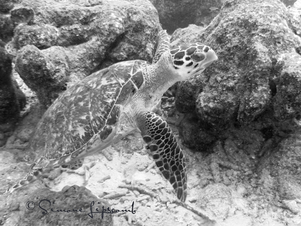 Once the turtle was safely moving on without the spotlight, my dive buddy and I moved away from the group and found in front of us another hawksbill, a bit smaller, and so we hid our lights so as not to reveal her presence. We floated in the dark, gray ocean, barely able to see the outline of the turtle as we stayed between it and the other diver who was still searching for the original turtle. With loving hearts we fiercely protected our sea turtle friend.