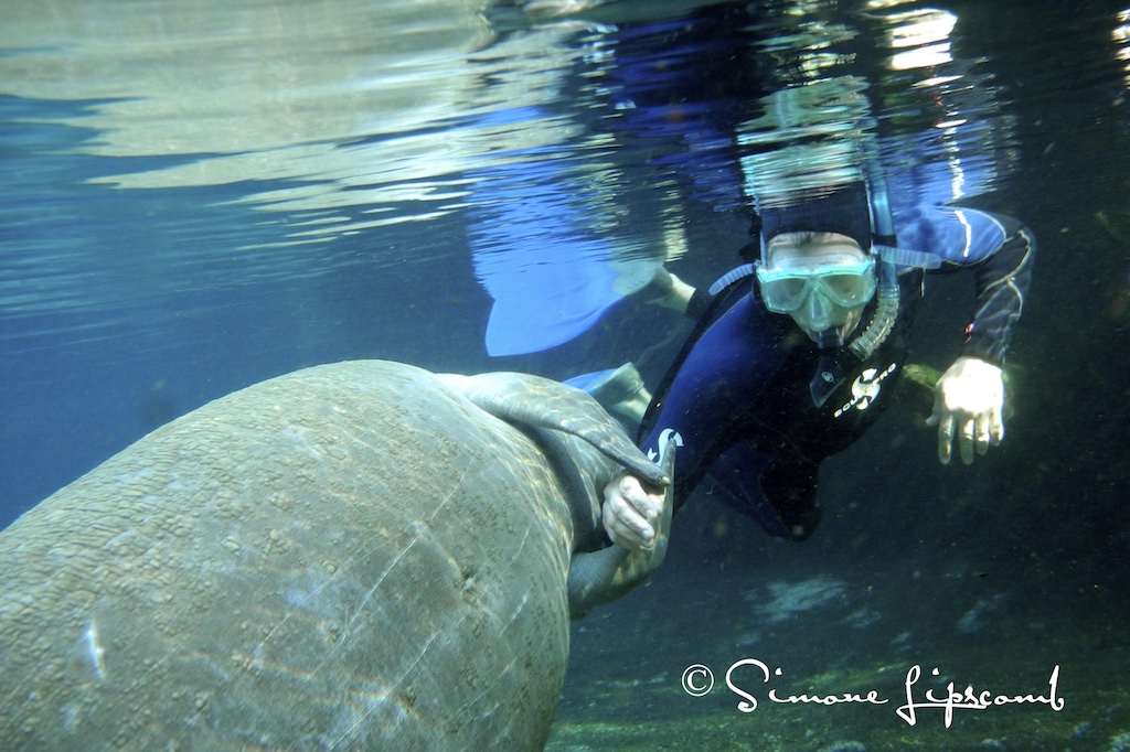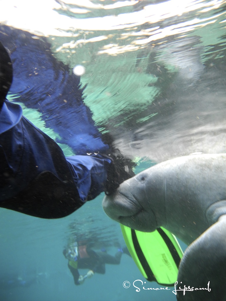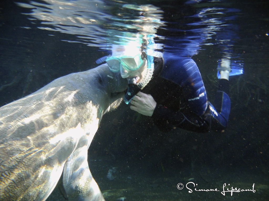 More than once I had larger manatees swim up to me, stop and snuggle against my side and then stay there. Having an animal much larger than me…by about 1000 pounds…. snuggle and whisper through their whiskers sweet manatee sonnets is quite profound. I don’t initiate anything and simply lay still at the surface. They come to me. I observe passively and sometimes one decides I’m worth knowing. If they approach I don’t move, if they snuggle I don’t move….but I do giggle sometimes.
