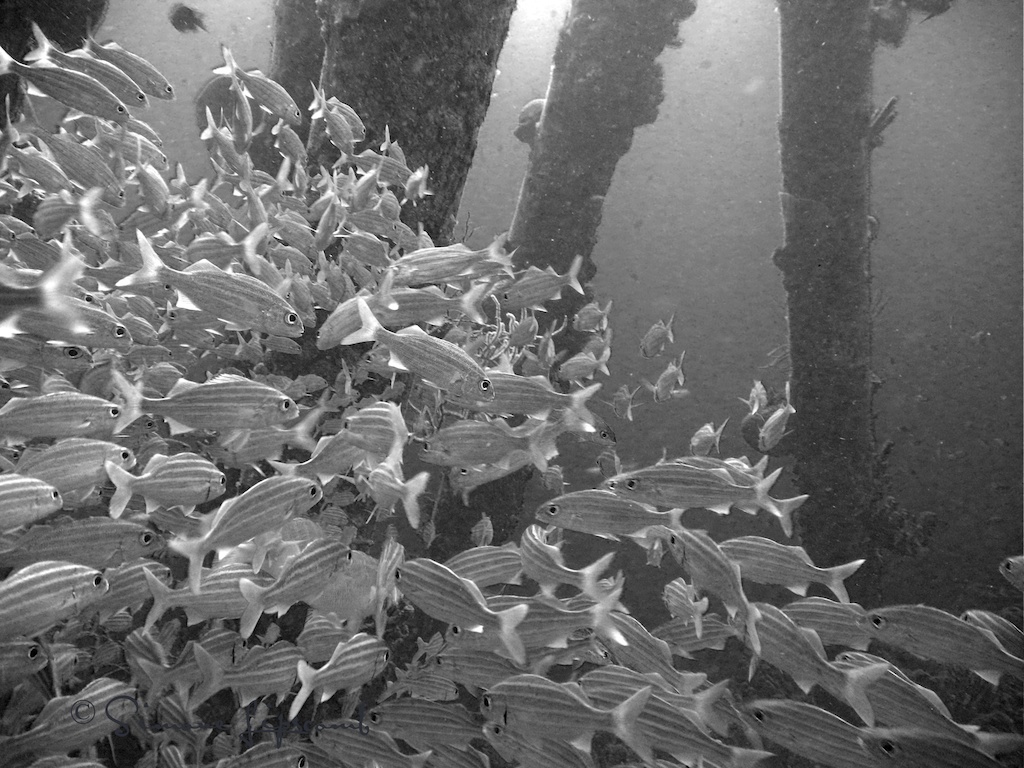 The Salt Pier is an operational salt production pier where ships are loaded with sea salt that is produced on Bonaire in evaporation ponds. When workers are not present, divers are allowed to visit and enjoy the amazing sea life that claims the pilings as home. It was here–amid hundreds of French grunts, a yellow-striped fish–where I experienced weightlessness as geometries and wild colors danced within inches of my mask.