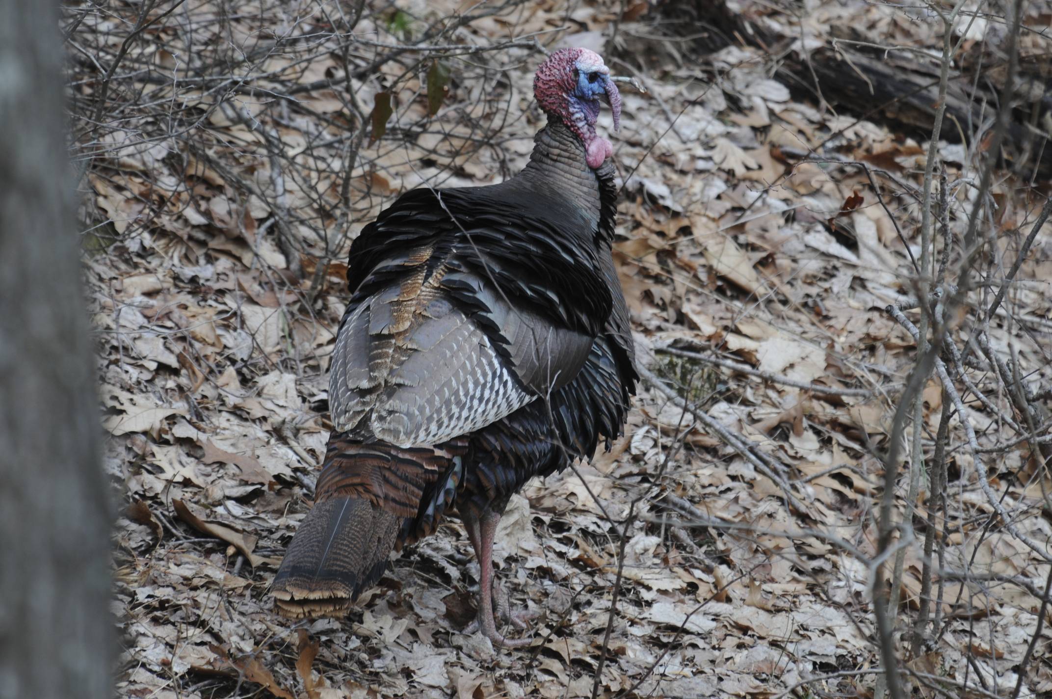I stood transfixed listening to wild turkeys vocalizing across the creek. The distinct and loud gobble of a male followed by the yelp of a female. For days as I walked the Mountain, I have heard the calls, have seen a dozen hens roosting in the huge, white pines overhanging the small creek. Today I wanted to find out where the chorus of wild bird sounds originated.