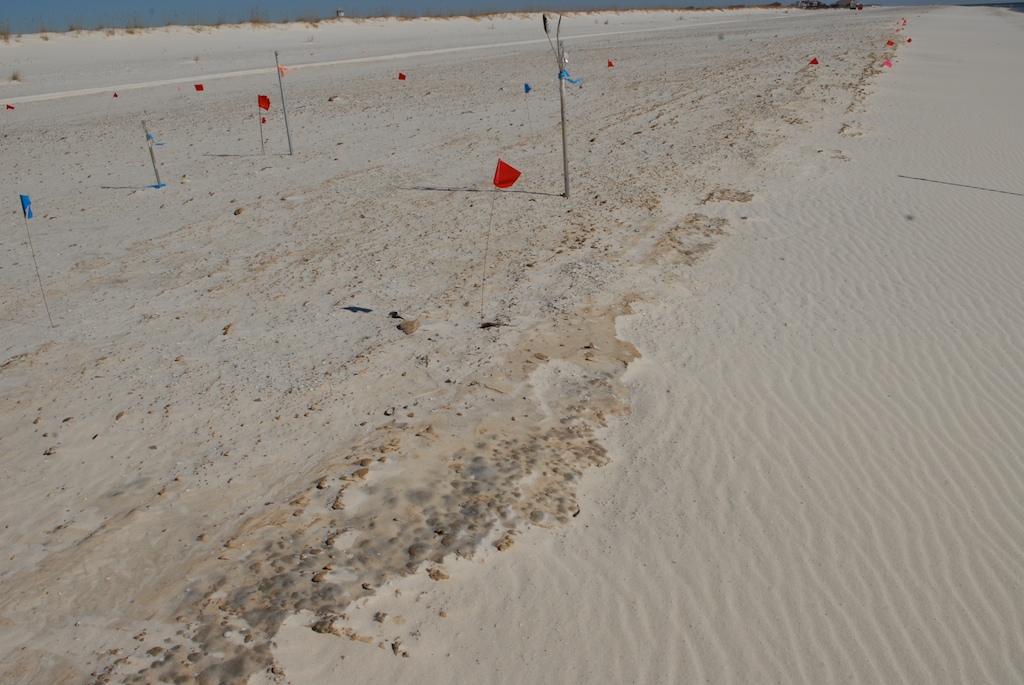 Two days later and sand, from a hefty north wind, had nearly covered the oil shelf. People might be tempted, in looking at this sight, to say, “It’s not so bad.” They just need to see what lies just beneath the surface to fully comprehend the amount of oil still present on the beach at the Bon Secour National Wildlife Refuge.